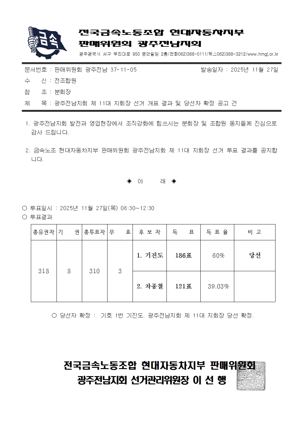 (37-11-05)±¤ÁÖÀü³²Áöȸ Á¦ 11´ë ÁöȸÀå ¼±°Å °³Ç¥ °á°ú ¹× ´ç¼±ÀÚ È®Á¤ °ø°í °Ç
